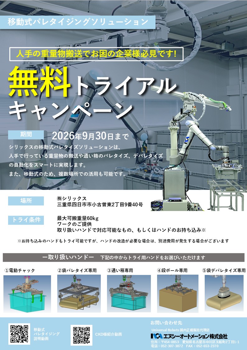 現在、『移動式パレタイジングソリューション』の無料トライアルキャンペーンを実施中です。 実機で効果をご確認いただけるチャンスです。ぜひこの機会にお試しください!